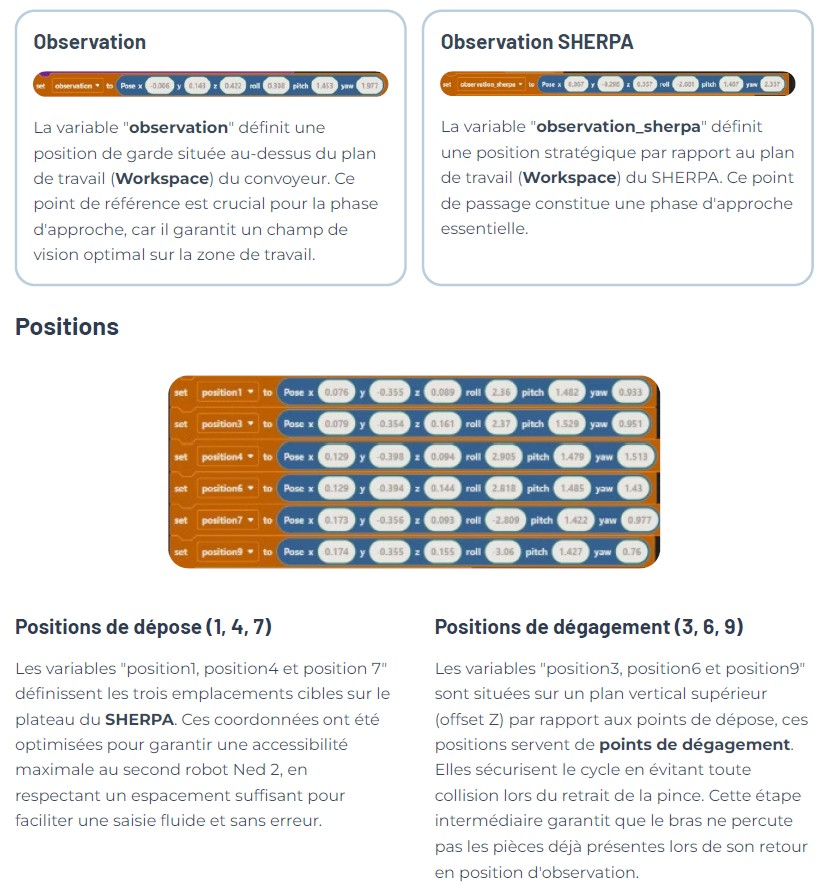 La phase de conception a débuté par la modélisation de l'environnement de travail (consultable dans la section "Environnement du projet") Après avoir validé le schéma de conception et défini le scénario industriel, nous avons procédé à la configuration des deux Workspaces (zones de travail) : celui embarqué sur le SHERPA et celui assurant l'interface entre le Ned 2 et le convoyeur. Une fois ces environnements définis, nous avons cartographié l'ensemble des coordonnées nécessaires au cycle de fonctionnement. Pour optimiser la clarté et la maintenance du code, j'ai eu l'idée de clarifier le programme avec de variables de position nommées, permettant d'associer chaque coordonnée cartésienne à un alias explicite. Vous trouverez ci-contre des photos justifiant et expliquant la pertinence de choix réalisés lors de la programmation du robot.