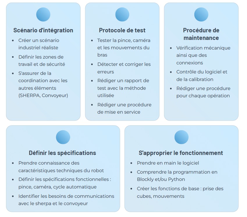 Dans le cadre de cette SAE, le robot Niryo Ned 2 agit comme un bras de manipulation de fin de ligne. L'ordre 1 montre que le robot assure la transition entre le