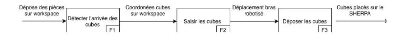 F3 - Dépose : Le robot dépose les cubes sur le SHERPA. Cette étape valide la fin du cycle et déclenche le signal autorisant le départ du robot mobile pour sa