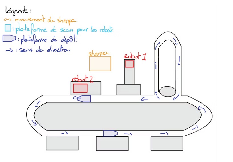 bras du convoyeur et le robot mobile SHERPA. Le robot doit non seulement manipuler les objets avec précision, mais aussi synchroniser son mouvement avec l'arrivée